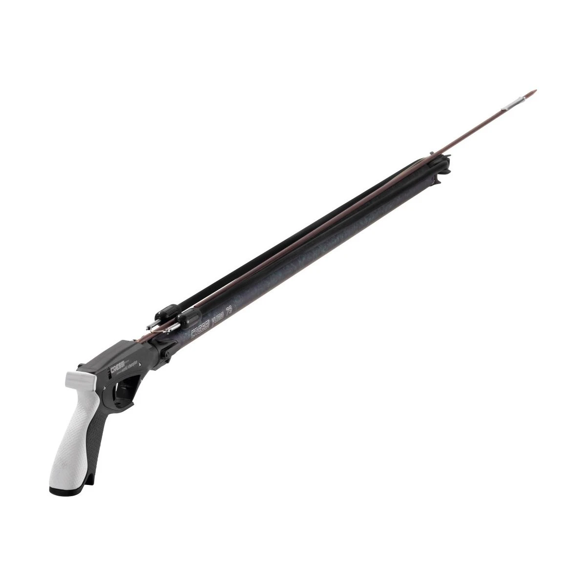 En seriøs jagt harpun fra Cressi. Yuma er en gun alle seriøse uv jægere har i bilen, for den er virkelig allround. Store havørreder, bars, fladfisk, torsk you name it. Den er kraftig og med en gennemgående elastik på hele 16mm får man virkelig et hurtigt og præcist skud. Open muzzle betyder at spydet ligge ovenpå elastikken, det giver bedre sigt og når man først har vænnet sig til det, findes der ikke noget der lader hurtigere. Det kan betyde du får flere multer i et træk eller at den helt store havørred du missede, alligevel bliver din. Spydet er forstærket og 6mm, håndtaget er anatomisk og lækkert at holde på.