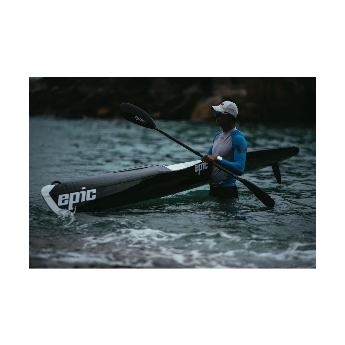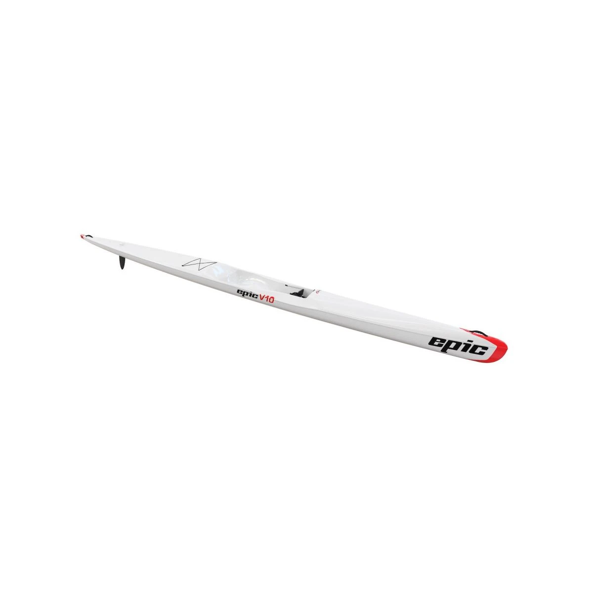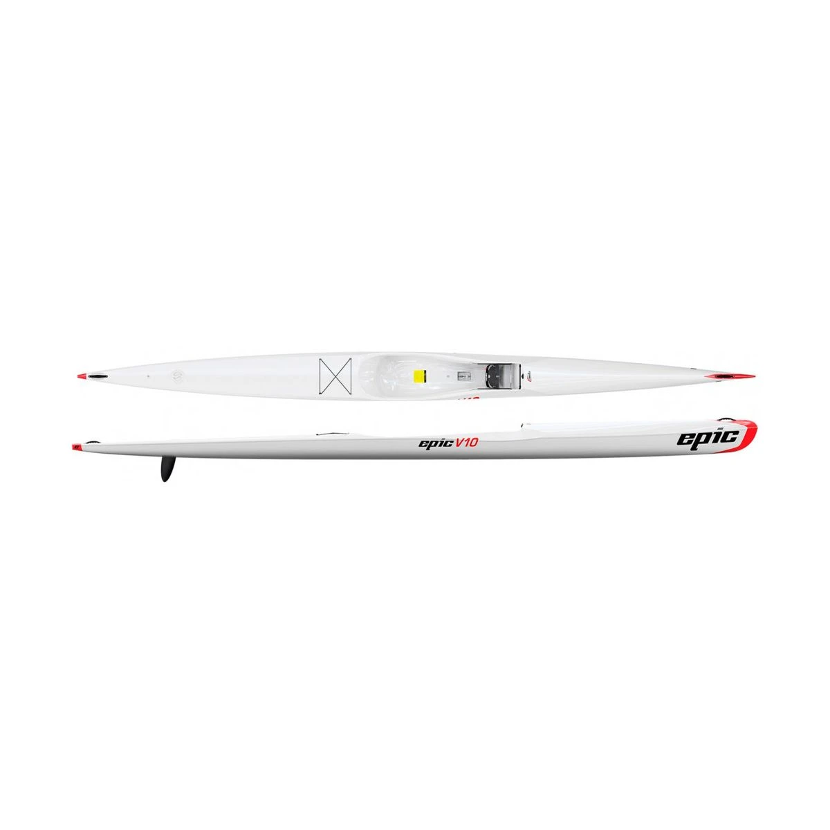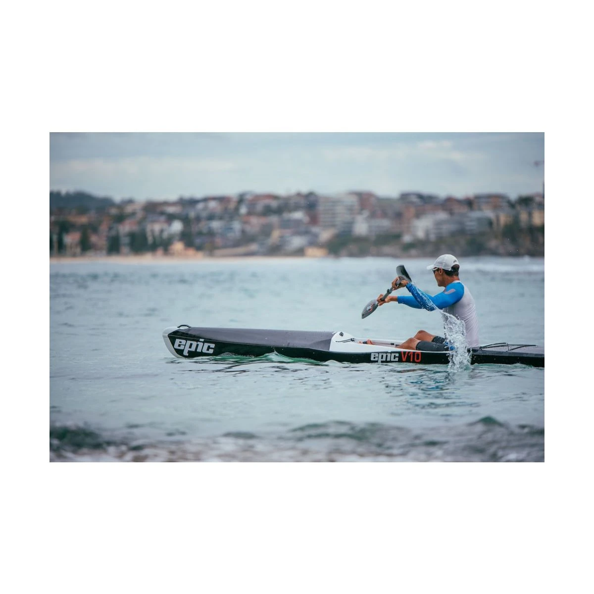 Epic mest succesrige surfski gennem tiderne. Den oprindelige V10 kom i 2005 og satte en hel ny standard for surfski. Mange af de design-detaljer, som V10 introducerede, er i dag standard på surfski fra producenter over hele verden. V10 modellen har vundet stort set alt hvad der er værd at vinde i surfski indtil flere gange, bl.a. 3 x vinder af Molokai Race på Hawaii (uofficielt VM for surfski). V10 er den mest stabile hurtige surfski på markedet. Den kommer især til sin ret i bølger, hvor V12 og V14 er hurtigere på fladt vand, men mere ustabile. Epic laver nogle af verdens bedste Surf Ski designet i samarbejde mellem 12 x verdensmester i Surf Ski Oscar Chalupsky og 2 x OL guldvinder Greg Barton. Greg Barton giver følgende beskrivelse af den nye V10: “Oscar Chalupsky and I have logged many thousands of kilometers in the V10, as well as our newer models (V12, V10 Double, V14, etc.). Between feedback from Elite paddlers around the world and our own observations in a variety of conditions, we learned enough to make a great boat even better. With the NEW V10, we tweaked the cross section shapes and volume distribution to optimize the hull for less drag at race speeds. Then we worked with the rocker profile and above water shapes to improve handling both into the wind and downwind. Through all of this we found increased stability in addition to the speed improvements. Oscar’s philosophy is “stability before ability”. The new V10 is the most stable of all elite level surf skis. Expert paddlers will appreciate being able to apply full power in all conditions. Likewise, paddlers who have mastered our V10 Sport or surf skis with similar stability will find an easy upgrade to the new V10 and put themselves in a new league. We re-designed the V10 seat for better comfort. The ergonomics are improved with a narrower width at paddle entry. The new V10 will fit paddlers from 5’4″ to 6’8″ height (1.62 to 2.03m).” V10 er udstyret med Epics nye bailer. Det betyder helt tørt cockpit og ingen ekstra vandmodstand, når den er lukket på fladt vand, og samtidig suger den langt bedre end andre bailere, når den er åben. Den kan åbnes og lukkes med hælen af foden, mens du ror. Det er virkelig en genial detalje og Epic har selvfølgelig ansøgt om patent.