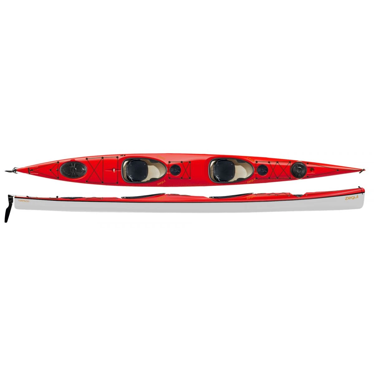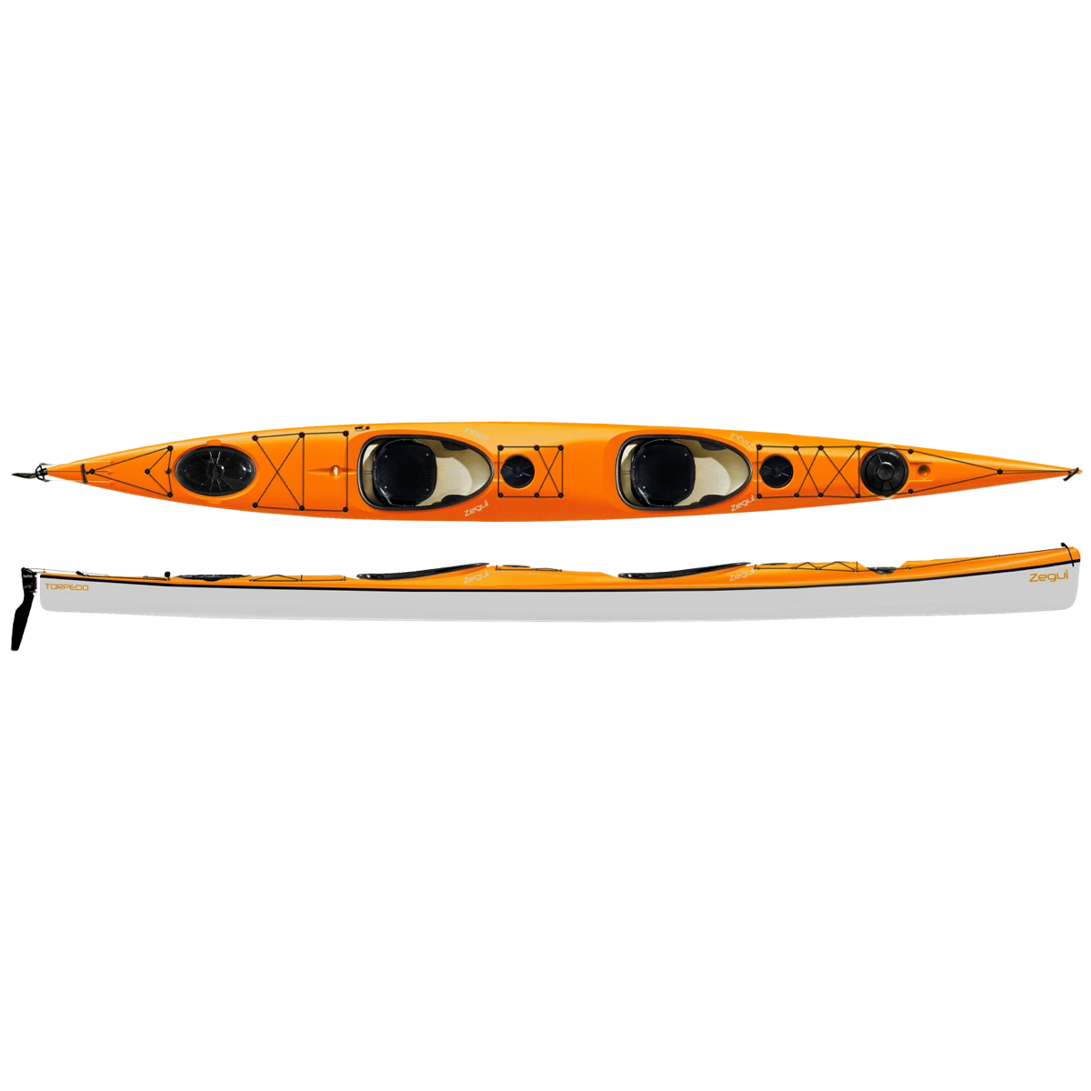 Zegul torpedo er en lækker kajak til 2 personer. Kajakkens bredde giver en god stabilitet, samtidig med at skrogets facon giver en god fart. Det er kajakken til lange ture for 2 personer. Torpedo leveres i a-core sandwichkonstruktion. Kajakken er designet med en lang vandlinie og skroget har en flad V-form og en flad profil. Dette giver kajakken en høj retningsstabilitet og gør den særdeles velegnet til længere ture.